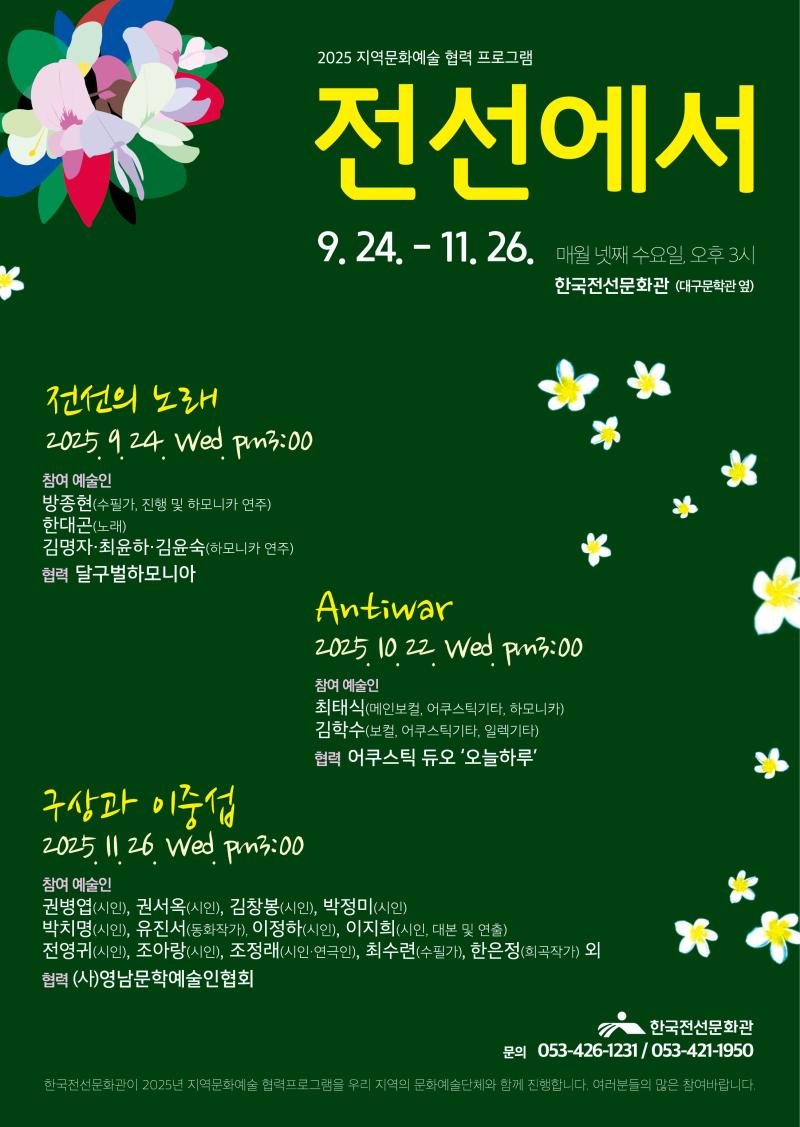 한국전선문화관(대구 중구 북성로 104-11)은 오는 9월 24일부터 11월 26일까지 매월 넷째 수요일 오후 3시,〈2025 전선에서〉를 진행한다고 밝혔다. 이번 프로그램은 하모니카 공연, 포크 음악, 시극과 낭송 등 다양한 무대를 통해 ‘전선문화(戰線文化)’의 의미를 예술적으로 재해석하는 자리다.