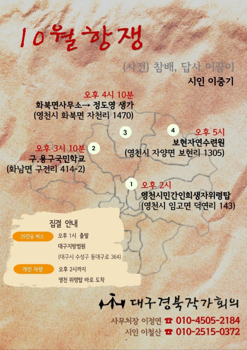 첫날 일정은 영천시 민간인희생자 위령탑과 구전리, 정도영 생가 등을 답사하는 ‘10월 항쟁 현장 기행’에 이어 영천 보현자연수련원에서 1이중기 시인이 전하는 영천 항쟁 이야기와 작가회의 회원 시낭송으로 본 행사의 막을 연다. 또 제주작가회의가 제주 4·3 항쟁 이야기와 시극 ‘그해 겨울의 가족사’를 무대에 올리고, 경산신문 최승호 대표가 ‘경산 코발트 광산’ 이야기를 들려준다. 저녁에는 개똥이 노래단(우창수·김은희)의 공연이 펼쳐진다.