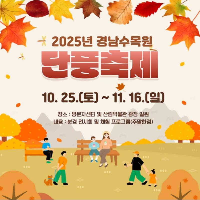2025 경상남도수목원 단풍축는 2025년 10월 25일(토) ~ 11월 16일(일) 까지 경남 진주시 이반성면 수목원 386, 경상남도수목원 일원에서 개최됩니다,