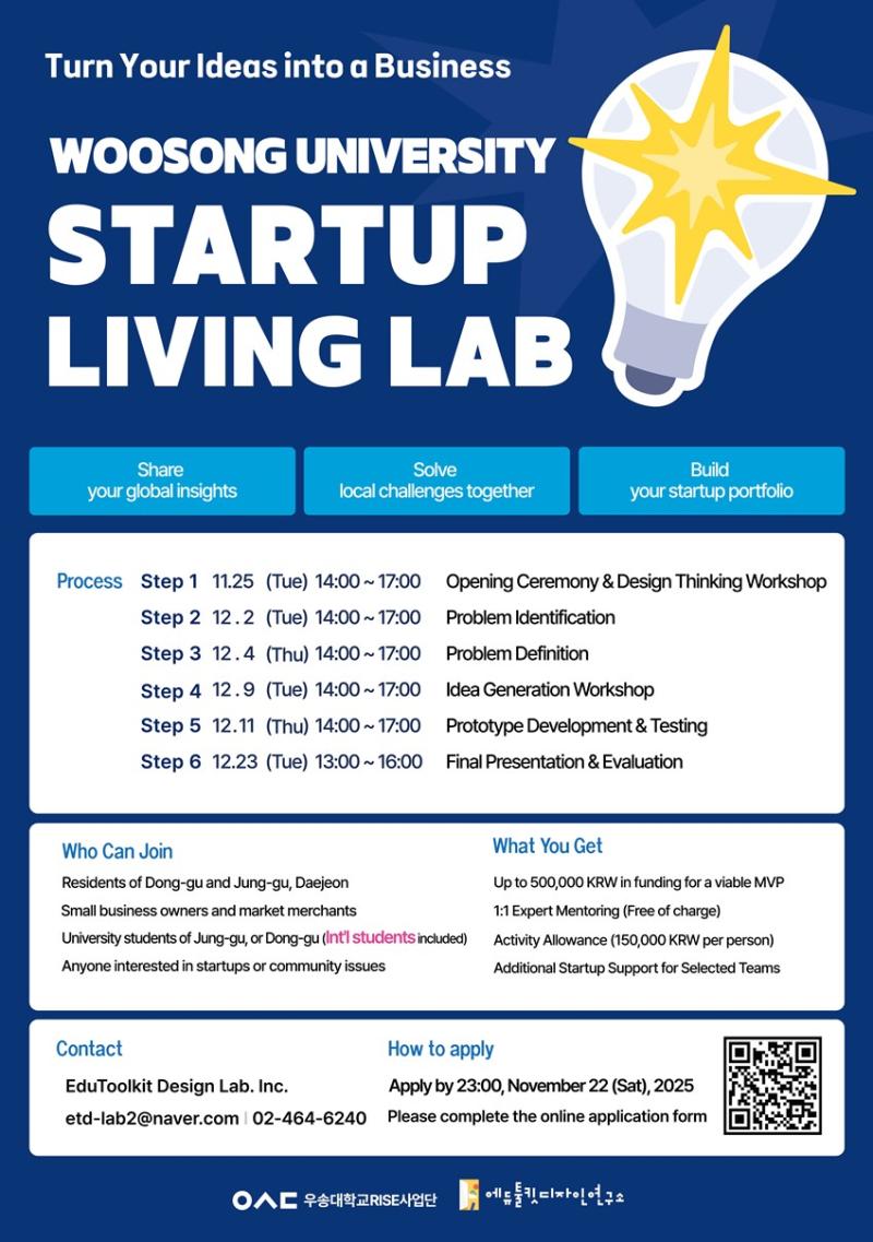 지역 주민과 외국인 유학생이 한 팀을 이뤄 실제 창업 모델을 만들어가는 ‘다문화형 창업 리빙랩’ 방식이어서 관심이 모인다. 우송대학교 산학협력단(단장 정병현)은 에듀툴킷디자인연구소(대표 김성희)와 협력해 ‘지역주민 및 외국인 학생 창업 리빙랩’ 참여자를 오는 22일까지 모집한다. 모집 대상은 대전 동구·중구 지역 주민, 소상공인, 전통시장 상인, 지역문제 해결에 관심 있는 시민, 외국인 유학생 등 5개 그룹이다.