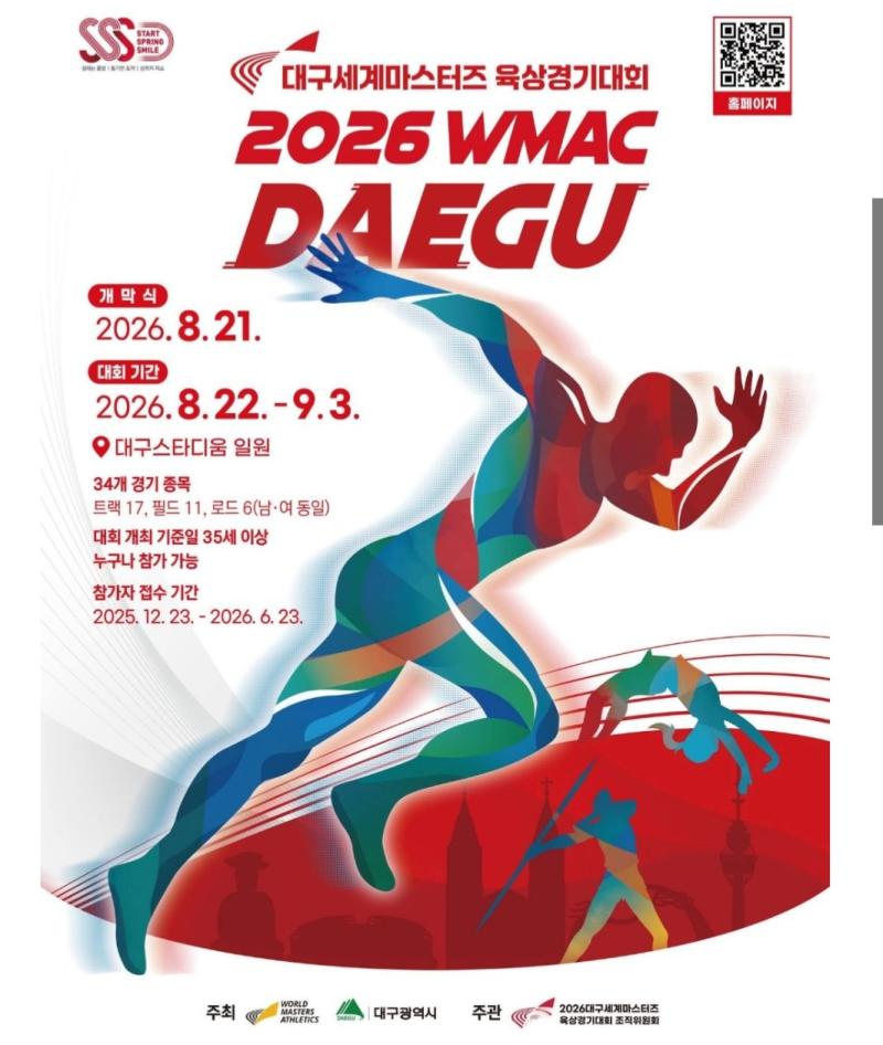 관련 대회로 대구마라톤 마스터즈 부문으로 대구에서는 마스터즈(연령별 참가) 카테고리가 있는 2026 대구마라톤은 2026년 2월 22일(일) 09:00 종목은 풀코스(42.195km), 10km, 건강달리기 성격입니다. 일반 참가자(마스터즈 포함)와 동호인도 지원 가능하고 마스터즈 부문은 나이·기록에 따라 분류되며, 생활육상 동호인들에게도 열려 있어 한마당 축제가 될 듯해 보다 많은 동호인들의 참여를 권고합니다.