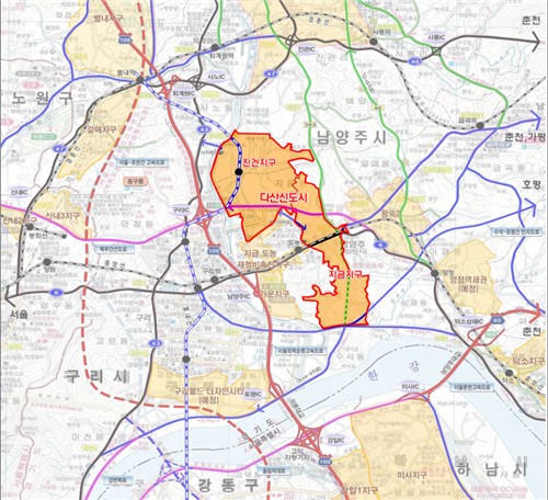 다산신도시는 남양주시 다산동 일원 약 475만㎡ 부지에 조성된 신도시로, 진건 및 지금지구로 구성된다.