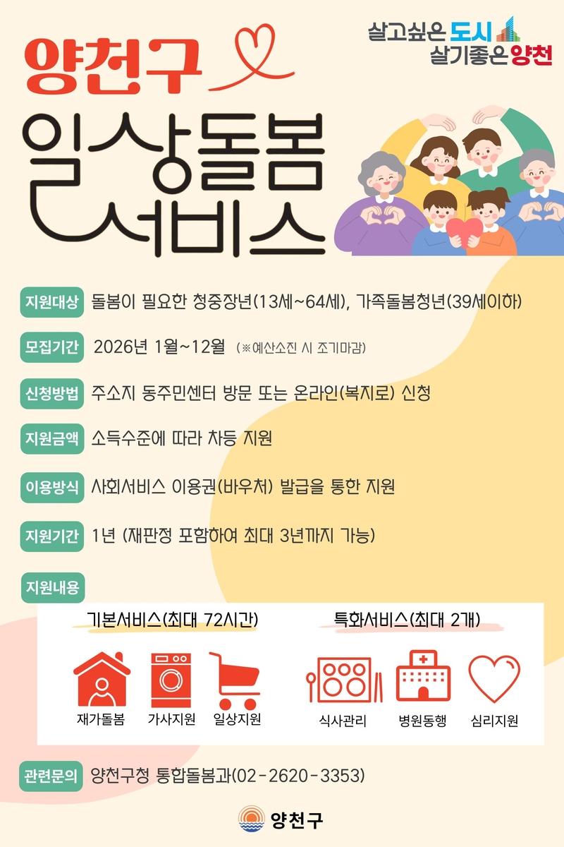 양천구(구청장 이기재)는 일상생활에 어려움을 겪는 청·중장년과 가족돌봄청년을 더욱 두텁게 지원하기 위해 2026년부터 '일상돌봄 서비스'를 확대 시행한다고 10일 밝혔다.
