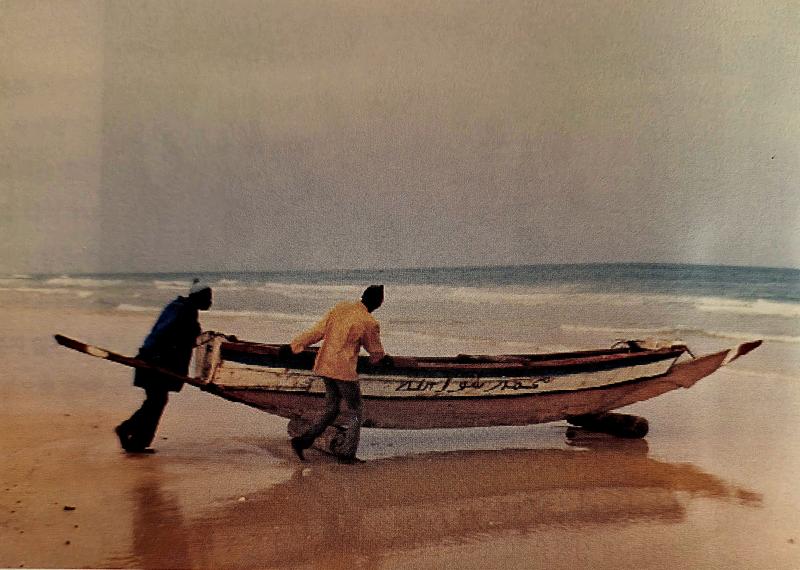 제대로 된 포구도 없는 곳에서 배를 밀어 바다로 나가는 어부들.