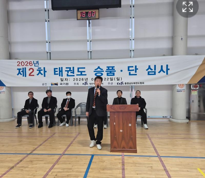 충청남도 태권도협회(회장 김진호)는 22일 한국기술대학교 체육관에서 '2026년도 제2차 국기원 승품ㆍ단 심사'를 천안시 태권도협회(회장 김석승)주관으로 개최했다.