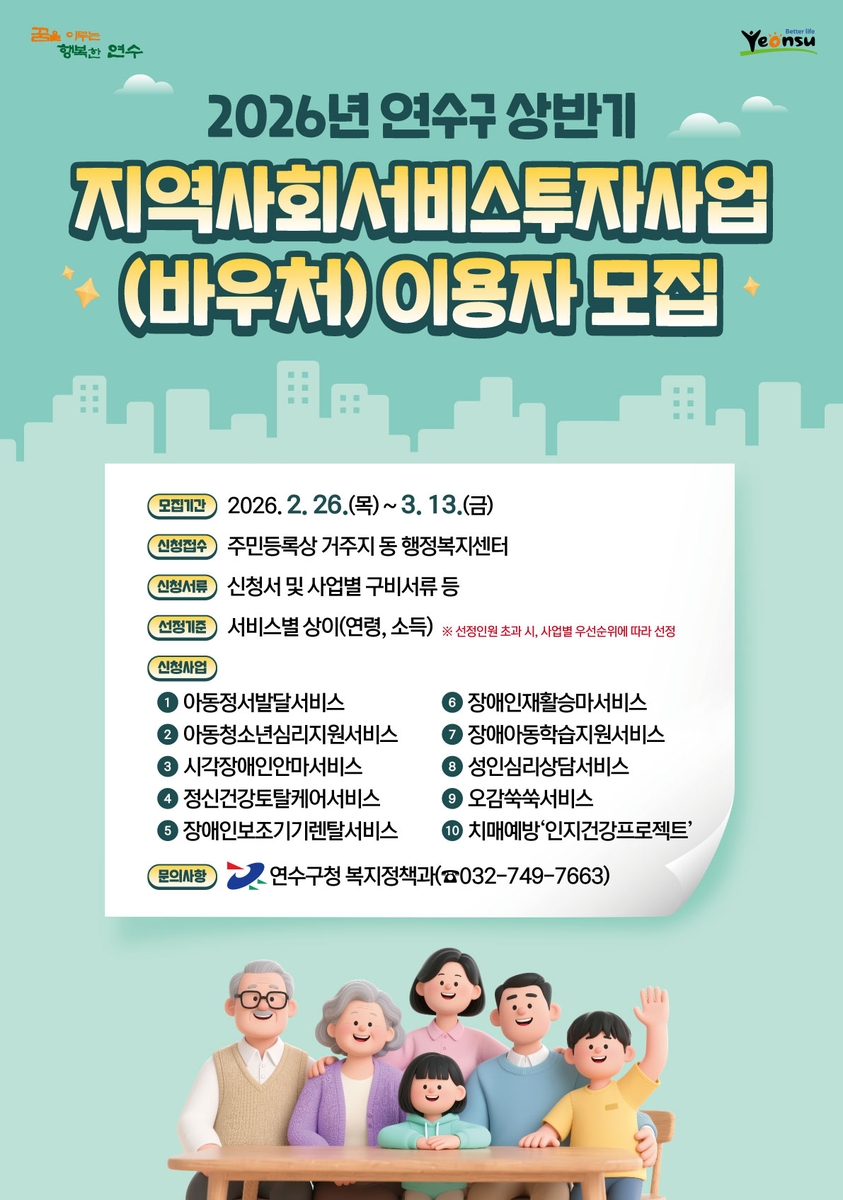 연수구(구청장 이재호)는 오는 26일부터 다음 달 13일까지 '2026년 지역사회서비스투자사업'의 이용자 1천 명을 모집한다.