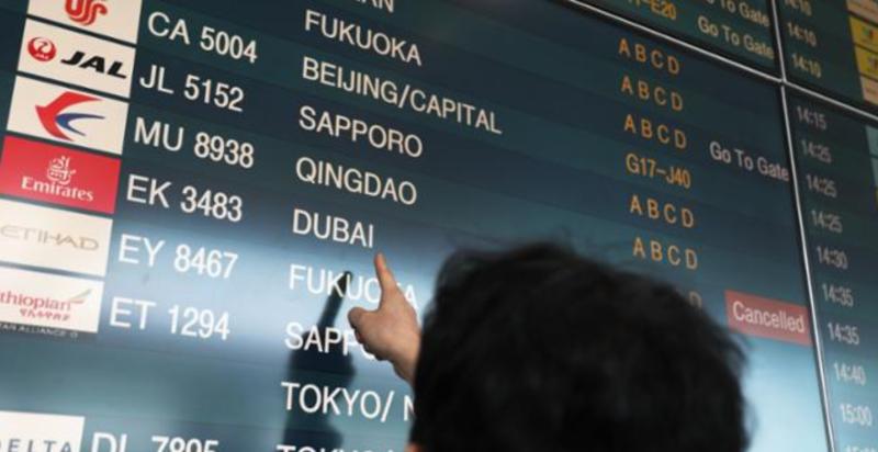미국·이스라엘과 이란이 공격을 주고받으며 중동 지역 긴장이 고조된 1일 인천국제공항에서 한 남성이 에미레이트항공 두바이행 항공편이 결항된 전광판을 손으로 가리키고 있다. 연합뉴스