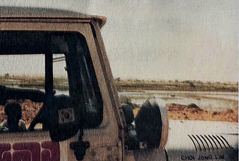 우리는 그물판과 담요를 포개 그 위에 조심스레 자키를 올리고 차체가 오르는 만큼씩 모래와 돌을 휠 밑으로 밀어넣었다. 차에 있는 딱딱한 모든 것 또한 다 그 밑으로 쑤셔넣었다 그리고 연이어 차체를 들어 올리는 자키 밑을 또 보강하고… 미치겠다. 지나가는 놈들이 내는 먼지를 입도 가리지 못한 채 그대로 마시고 있다.