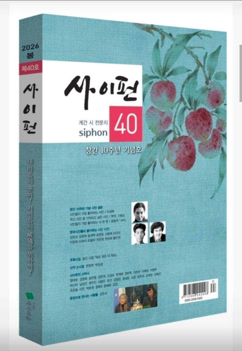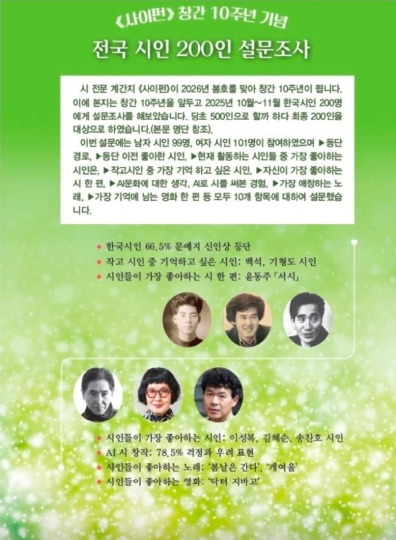 창간 10주년 맞은 사이펀 봄호 표지(사진=사이펀 제공)부산에서 발간되는 시 전문 계간지 『사이펀』이 창간 10주년을 맞아 국내 시인들의 취향을 집약한 설문 결과를 발표했다. 이번 조사는 2025년 10월부터 11월까지 진행됐으며, 현재 창작 활동을 이어가고 있는 시인 200명이 참여했다. 응답자는 남성 99명, 여성 101명으로 구성됐다.