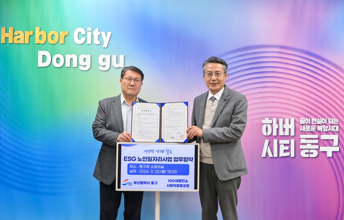 부산 동구(구청장 권한대행 박진석)는 23일, 100세발전소 사회적협동조합(대표 김채령)과 'ESG 기반 자원순환 및 노인일자리 창출을 위한 업무협약'을 체결했다.