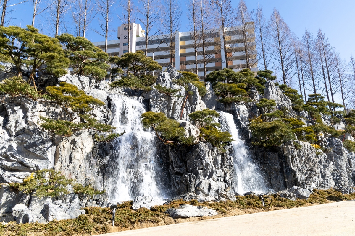 폭포 외관에는 전국 각지에서 엄선한 자연석(기암괴석)을 활용하고, 소나무와 계절별 야생화를 조화롭게 배치해 깊은 산세의 정취와 자연의 아름다움을 한층 돋보이게 했다.