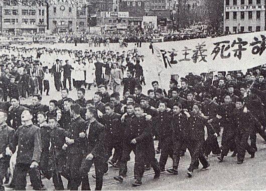 4.19혁명 당시 학생과 시민들이 거리로 나와 격렬하게 시위를 하고 있는 장면