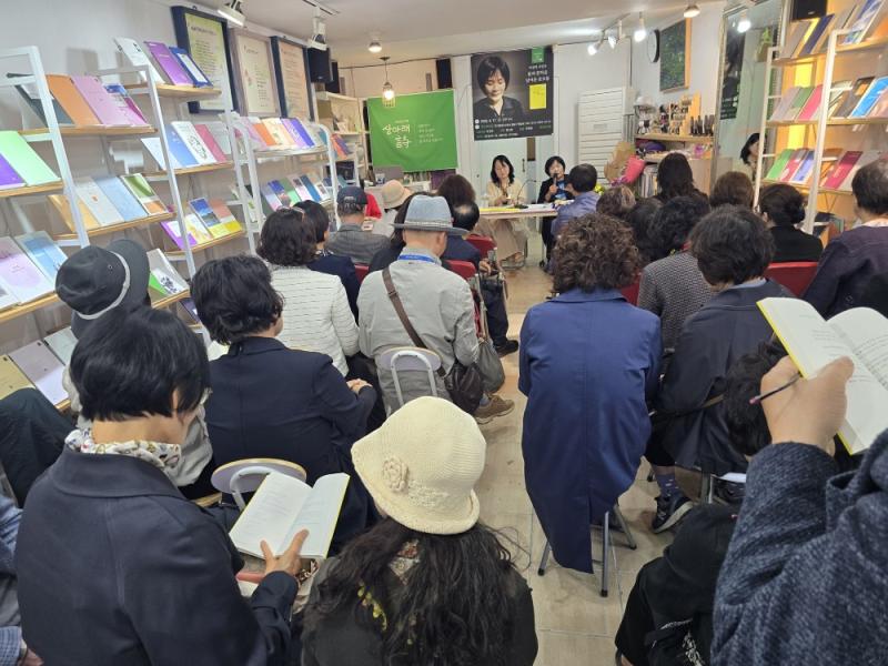 책방 한쪽 벽을 채운 시집들의 색채는 마치 또 하나의 시처럼 놓여 있었다. 연한 파랑과 초록, 노랑의 표지들이 만들어내는 풍경 속에서 참석자들은 천천히 자리를 정리했다. 행사가 끝난 뒤에도 몇몇 독자들은 쉽게 자리를 떠나지 못하고 책장을 다시 넘기거나 시인에게 조용히 말을 건넸다.