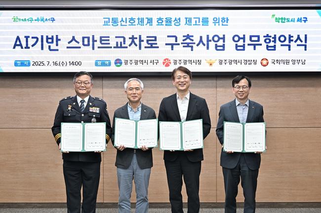 서구는 16일 서구청 나눔홀에서 광주광역시, 광주경찰청과 함께 'AI 기반 스마트교차로 구축사업'을 위한 업무협약을 체결했다. 협약식에는 김이강 서구청장을 비롯해 양부남 국회의원, 고광완 광주시 행정부시장, 박준성 광주경찰청 생활안전부장 등 각 기관 관계자들이 참석했다.