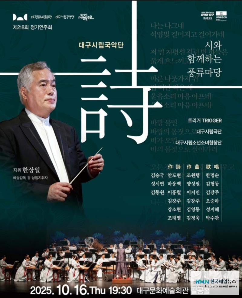 대구시립국악단 218회 정기연주회 포스터. (사진= 대구문화예술진흥원)대구시립국악단(예술감독 겸 상임지휘자 한상일)이 오는 10월 16일(목) 오후 7시 30분, 대구문화예술회관 팔공홀에서 제218회 정기연주회 ‘시와 함께하는 풍류마당’을 선보인다.