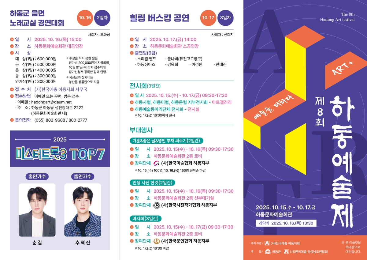 이어서 16일 오후 2시에는 문화예술회관에 개막식이 개최되며, 오후 3시에는 하동군 읍면 노래교실 경연대회와 미스터트롯3 TOP7의 춘길, 추혁진의 무대로 흥겨움을 더한다.
