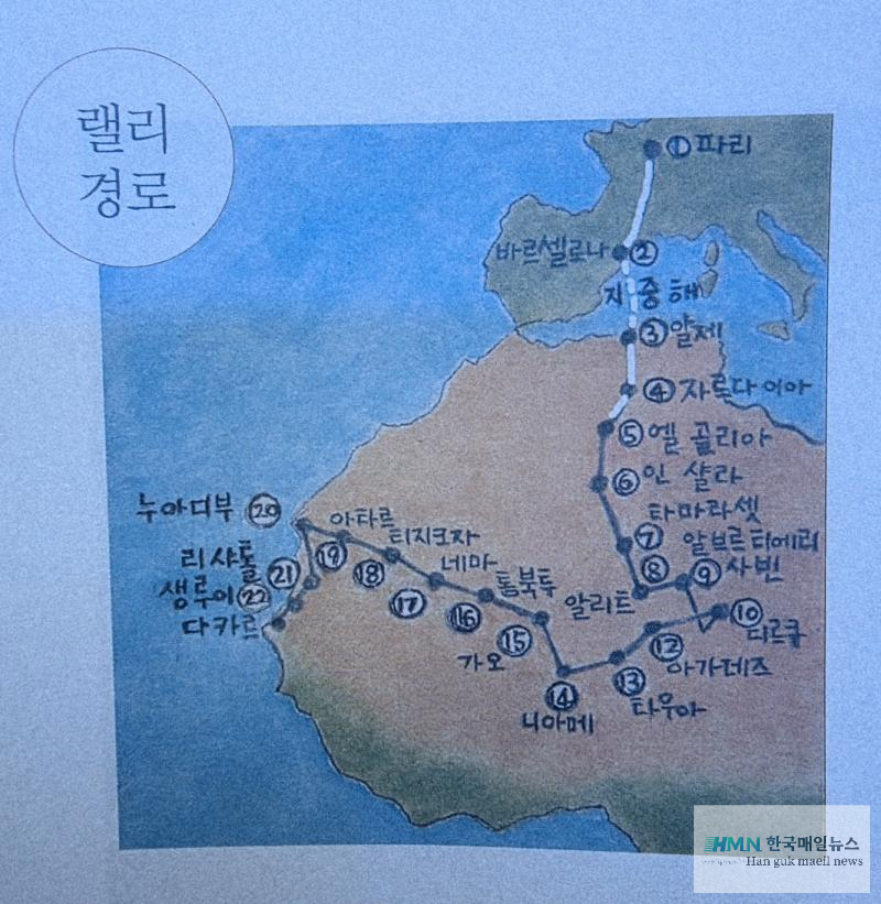 피스트 외각 주행 금지. 38.35km. 차는 시속 100km로 모래톱 위에 떠 있는 현상 기록을 트외곽 주행 계속 금지, 차는 지그재그의 커브를 주행하는 데 거의 60 ~70의 방향을 꺾어야 하고, 그때마다 5~6m씩 미끄러졌다.TV헬리곱터가 우리 위를 2바퀴 선회한 후 사라짐. 47.04km 나침반 240° 수정. 흰 모래 계속, 하씨 엘 하자Hassi El Had-jar의 폐허된 보루 왼쪽으로 선회. 64km 수많은 모래 무덤 시작. 곳곳에서 차들이 모래 무덤에 얹힘 "최대한 모래 무덤을 돌아라, 방향190으로 바꿔! 나는 끝없이 전개되는 상황을 제롬에게 고합쳐 주었다. 81km 지점 전방 100m 앞 급경사 모래 언덕. 15m 언덕 아래로 미끄러진 후 골을 가로질렀다. 건너편 흙모래 산, 우측 편으로 공격했으나 골의 커브를 벗어나지 못했다. 나는 제롬으로부터 핸들을 받았다. 후방 50m 까지 넉넉하게 후진. 사륜구동 저속 보조 기어로 갈고, 2단 기어로 최대 액셀러레이터, 좌편 35° 경사의 자갈 모래 산으로 공격. 중간에서 1단 기어로 바꾸었으나 정상 4m를 남기고 멈춰서 버렸다.