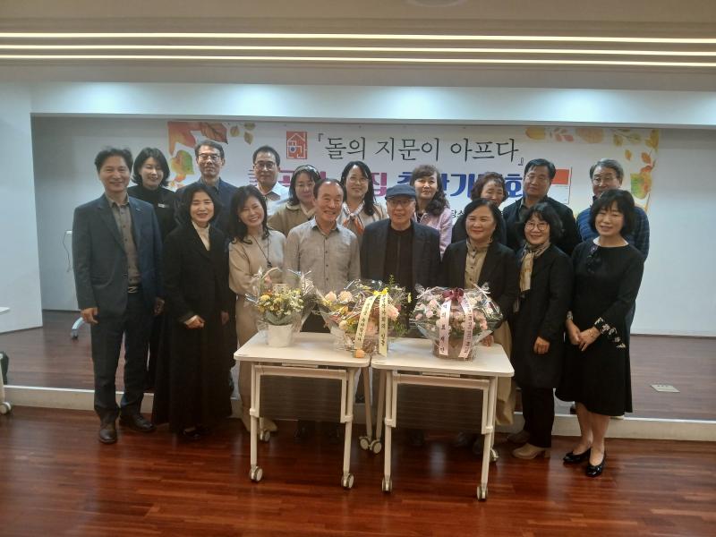 시공간 일곱 번째 동인지『돌의 지문이 아프다』출판기념회를 마치고 기념촬영을 하고 있다.대구·경북 지역 문학동인 시공간(회장 이복희)이 일곱 번째 동인지 『돌의 지문이 아프다』를 발간하고, 지난 10월 29일(수) 오후 5시 30분 대구 동구 정호승문학관 다목적실에서 출판기념회를 열었다.