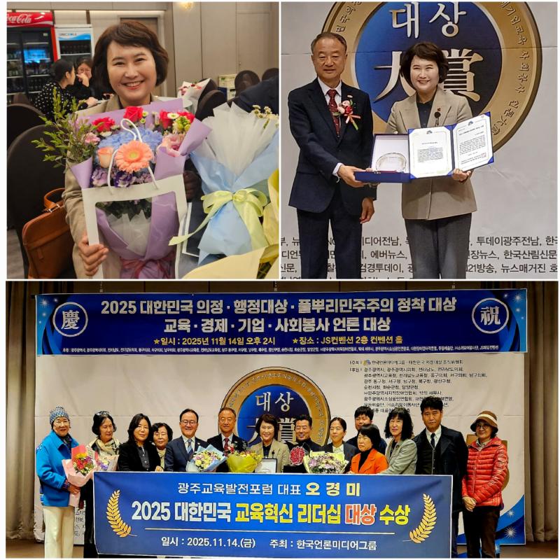대한민국 교육혁신 리더십 대상 오경미광주 JS컨벤션에서 열린 ‘2025 대한민국 의정대상’ 시상식에서 ‘대한민국 교육혁신 리더십 대상’을 수상