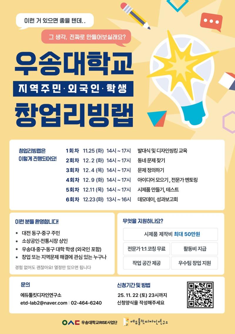 지역 주민과 외국인 유학생이 한 팀을 이뤄 실제 창업 모델을 만들어가는 ‘다문화형 창업 리빙랩’ 방식이어서 관심이 모인다. 우송대학교 산학협력단(단장 정병현)은 에듀툴킷디자인연구소(대표 김성희)와 협력해 ‘지역주민 및 외국인 학생 창업 리빙랩’ 참여자를 오는 22일까지 모집한다. 모집 대상은 대전 동구·중구 지역 주민, 소상공인, 전통시장 상인, 지역문제 해결에 관심 있는 시민, 외국인 유학생 등 5개 그룹이다.