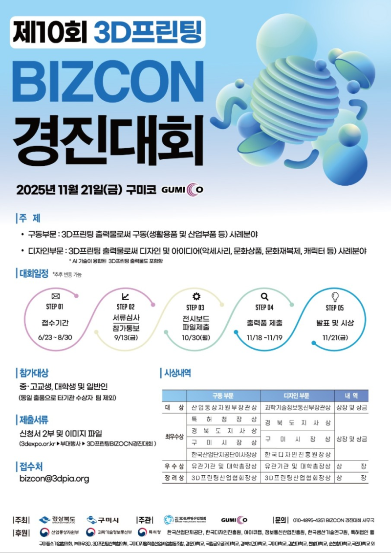 행사와 함께 진행되는 ‘3D프린팅 BIZCON 경진대회’는 산업 현장에서 요구되는 창의적 설계 능력과 응용력을 겨루는 대회로, 예선을 통과한 본선 진출작들이 행사 기간 동안 전시된다. 본선 심사는 21일 진행되며, 발표와 시상식을 통해 우수 기술을 선정한다. 구미시는 이번 대회를 통해 3D프린팅 기술의 실용성과 산업적 가치가 더욱 확장될 것으로 기대하고 있다.
