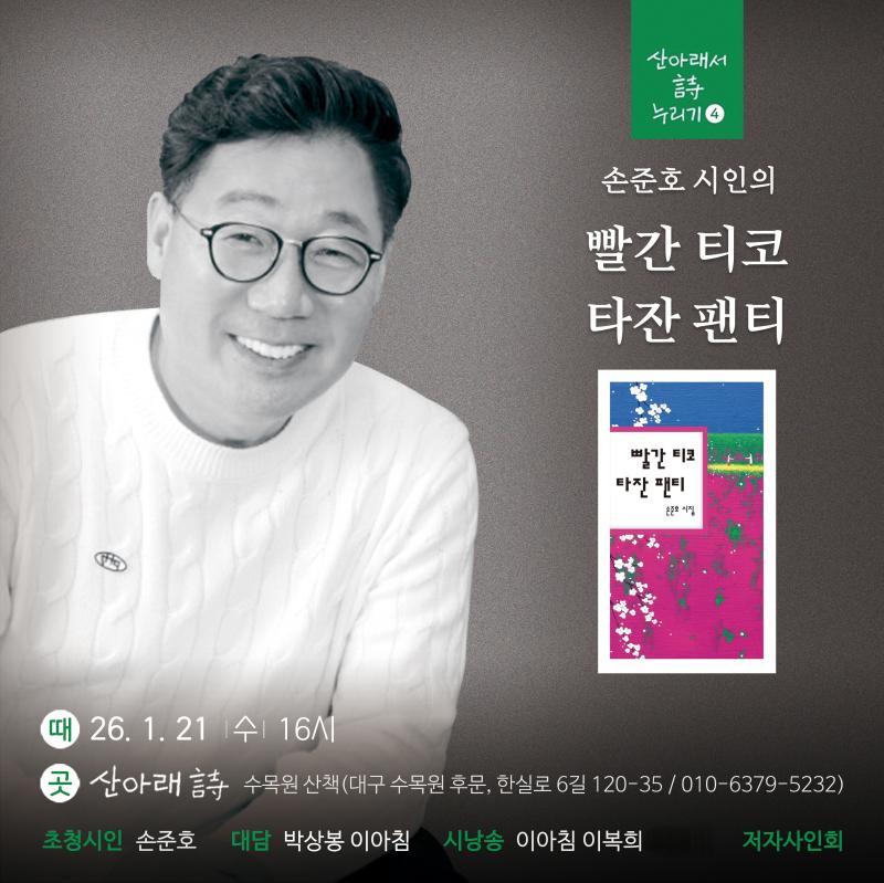 시집전문 책방 산아래 詩 수목원 산책의 네 번째 ‘산아래서 詩 누리기’ 손준호 시인 북토크대구 수목원 후문에 위치한 시집 전문 독립서점 ‘산아래 詩 수목원 산책’(대표 이영미)’이 오는 21일 오후 4시 새해 첫 시인과 독자가 직접 만나는 자리를 마련한다. ‘산아래서 詩 누리기’ 네 번째 북토크로 열리는 이번 행사에는 연이은 문학상 수상으로 시단에 화제가 되고 있는 손준호 시인이 참석해 독자들과 직접 소통하는 시간을 갖는다.박상봉 시인의 기획과 진행으로 펼쳐질 이날 행사에는 이아침 시인이 대담을 맡고 이복희 시인 등과 작품 낭송을 선보일 예정이다.