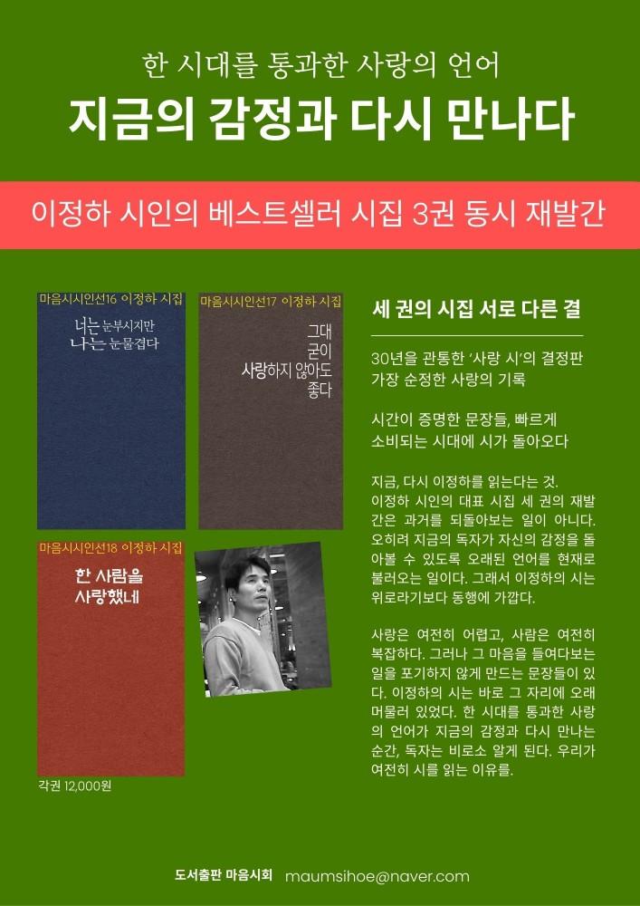 이날 행사는 이정하 시인의 베스트셀러 시집 『너는 눈부시지만 나는 눈물겹다』를 비롯해 『한 사람을 사랑했네』, 『그대 굳이 사랑하지 않아도 좋다』 등 대표 시집 세 권의 동시 재발간을 기념하는 자리로 마련된다.