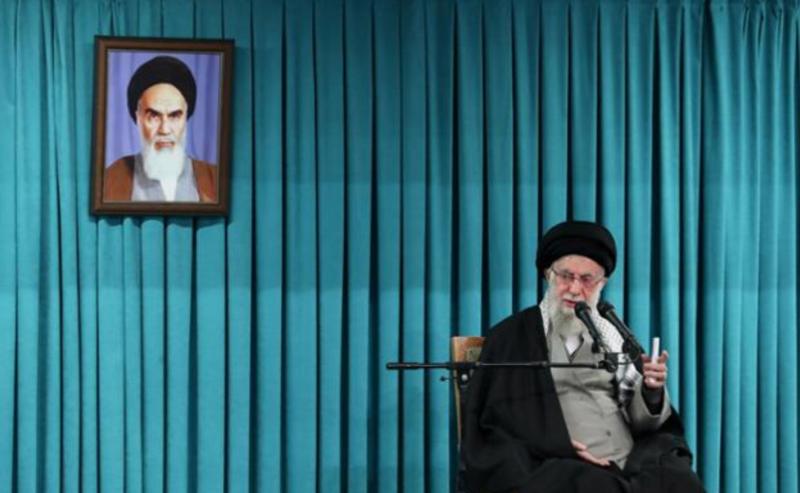이란 최고지도자 아야톨라 세예드 알리 하메네이가 지난해 3월 8일 이란 테헤란에서 관리들에게 연설하고 있다. 초상화 속 인물은 이슬람 공화국 창건자인 이맘 루홀라 호메이니. 이란 최고지도자실이 제공한 사진이다. AP 연합뉴스