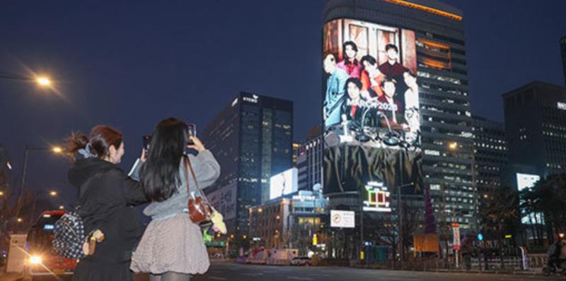 방탄소년단(BTS) 완전체 컴백 공연이 이틀 앞으로 다가온 19일 서울 광화문광장 인근 빌딩 전광판에 컴백 공연을 알리는 광고가 표출되고 있다. [뉴스1]사진 확대