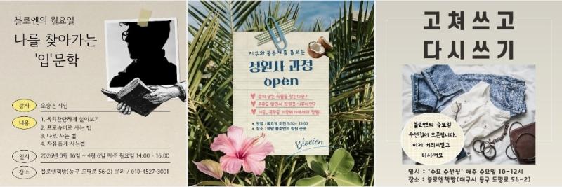 한편, 시집전문 독립서점 ‘산아래 詩’ 15번째 자매점으로 최근 오픈한 ‘산아래 詩 블로엔’(관장 장지연)은 대구 동구 불로동에 자리한 정원과 텃밭이 있는 동네책방이다. 또 매주 월요일에는 오승건 시인과 함께하는 ‘나를 찾아가는 입문학’ , 매주 수요일에는 ‘고쳐 쓰고 다시 쓰기’, 매주 목요일에는 ‘지구와 공동체를 돌보는 정원사 과정’, 매주 토요일에는 ‘전통음식 배우고 만들기’ 등 다양한 시민강좌가 마련돼 동네 문화센터로 역할을 톡톡히 하고 있다.