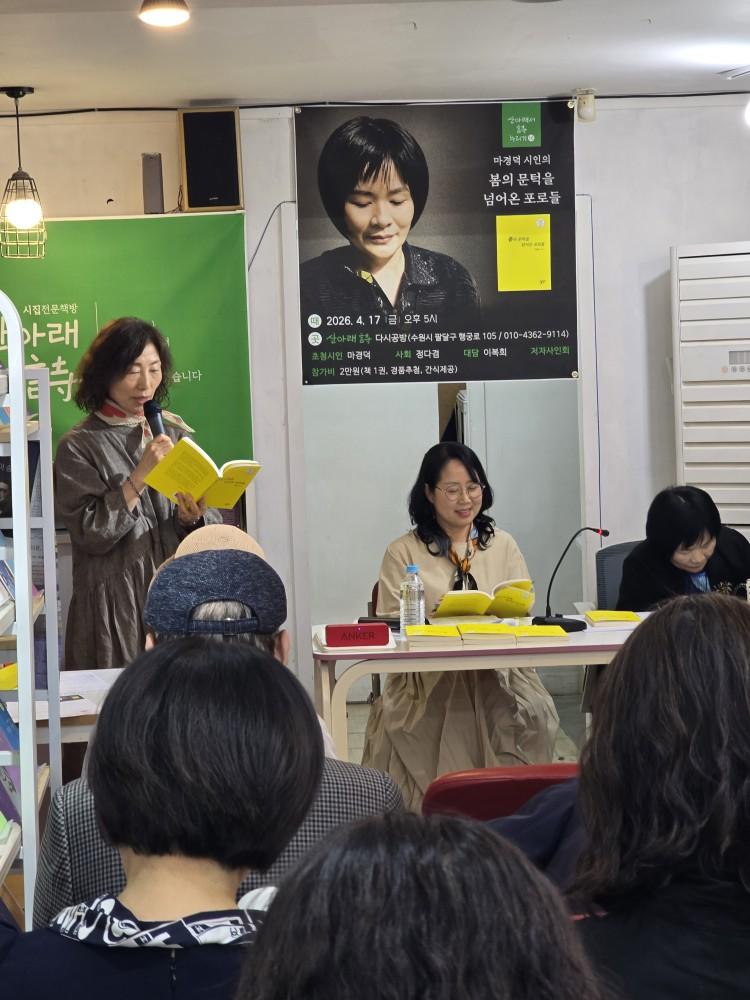 수원 팔달구 행궁로에 위치한 시집 전문 책방 산아래 詩 다시공방에서 열린 마경덕 시인의 북콘서트(사진=박상봉 기자)지난 4월 17일 오후 5시, 수원 팔달구 행궁로에 위치한 시집 전문 책방 ‘산아래 詩 다시공방’에서 마경덕 시인의 북콘서트 「봄의 문턱을 넘어온 포로들」이 열렸다. 공간을 가득 메운 독자와 문인들은 조용히 시적인 에세이의 문장을 따라가며 늦은 봄 저녁의 밀도 있는 시간을 함께 나눴다.